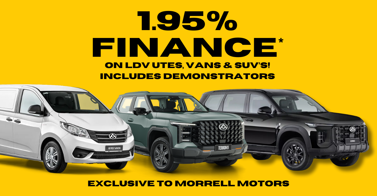 This 1.95% p.a. interest rate offer is fixed for the 36-month term of the loan and applies to new and demonstrator LDV models in stock and financed before the 31 March 2026 (or while stocks last), and requires a minimum deposit of 30% of the Recommended Retail Price. A PPSR fee of $10.35, monthly maintenance fee of $2, UDC loan fee of $130 and a dealer origination fee of $350 will apply. Offer excludes structured payments and is provided by UDC Finance Limited. UDC’s lending criteria and standard terms and conditions apply. This offer cannot be used in conjunction with any other offer.