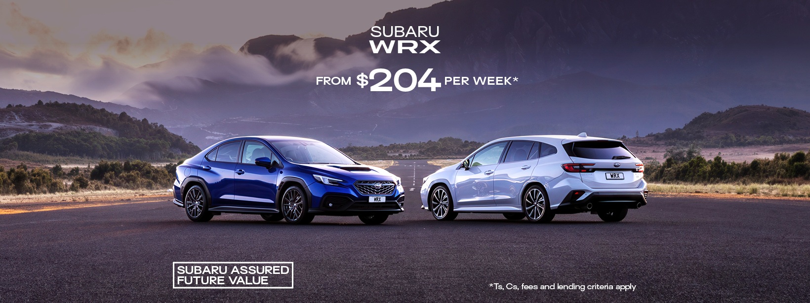 *The $203.55 per week repayments are based on the Subaru WRX 2.4 tS model with an RRP of $69,990, $1,250 on-road costs, a $13,998 deposit (20% of RRP), 8.95% p.a. interest rate fixed for the 48-month term of the loan, a total kilometre allowance of 40,000km and a $32,132.41 Subaru Assured Future Value payment at the end of the loan term. A $130 UDC establishment fee, $10.35 PPSR fee, weekly maintenance fee of $0.50, and a dealer origination fee of $455 will apply. The total cost of repayments is $74,261.55. This offer is available at participating Subaru dealers and is valid from the 20th October 2025 until the 31st of January 2026 (while stocks last) and is only available on new Subaru WRX 2.4 tS models. Subaru Assured Future Value and Subaru Financial Services is provided through UDC Finance Limited. UDC’s lending criteria, standard terms and conditions apply. Subaru Assured Future Value terms and conditions apply.
